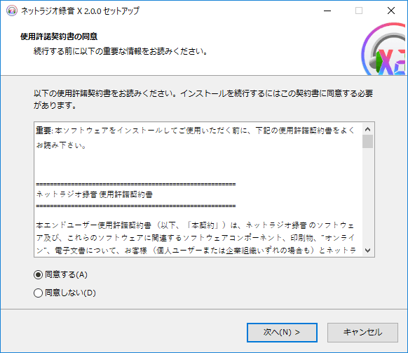 以下の画面が表示されたら「同意する」を選択し「次へ」をクリックしてください。インストールが開始されます。