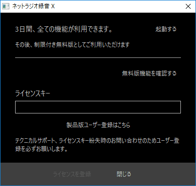 インストール完了すると、自動的に体験版、ライセンスキー登録画面が立ち上がります。1分以上待っても立ち上がらない場合は、起動方法を確認してください。